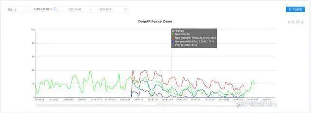 DeepAR 最后产生一个可选时间跨度的多步预测结果,单时间节点的预测为概率预测,默认输出P10,P50和P90三个值。这里的P10指的是概率分布,即10%的可能性会小于P10这个值。通过给出概率预测,我们既可以综合三个值给出一个值预测,也可以使用P10 – P90的区间做出相应的决策。有关 DeepAR 数学运算背景的更多信息,请参阅DeepAR:概率性预测与自回归递归网络。
