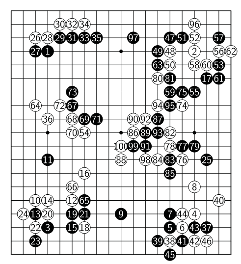 ▲图1-3 一局围棋棋谱(图中实心圆表示黑棋的棋子,空心圆表示白棋的棋子,圆里的数字记录棋子是在第几步被放在棋盘上,本图片改编自论文D. Silver, et al. Mastering the game of Go without human knowledge, Nature, 2017)