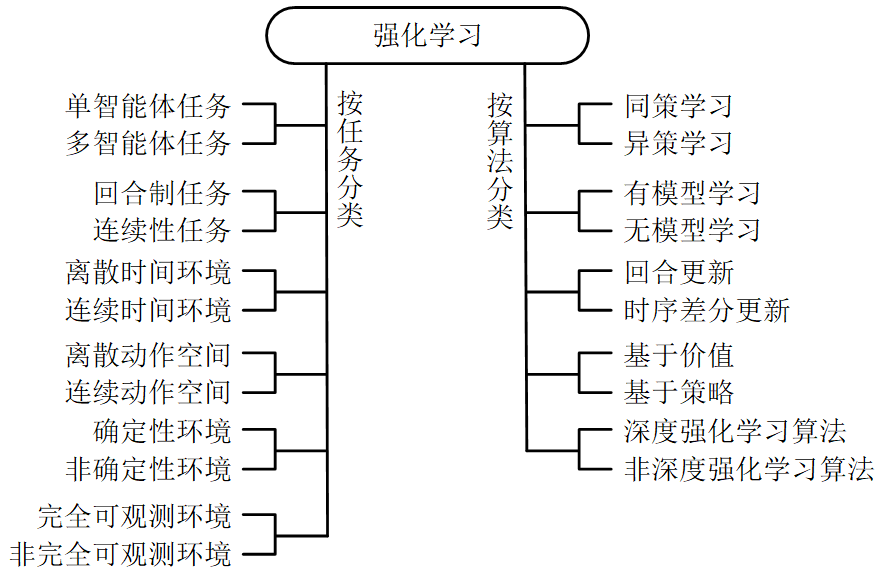 强化学习的任务和算法多种多样,本节介绍一些常见的分类(见图1-6)。