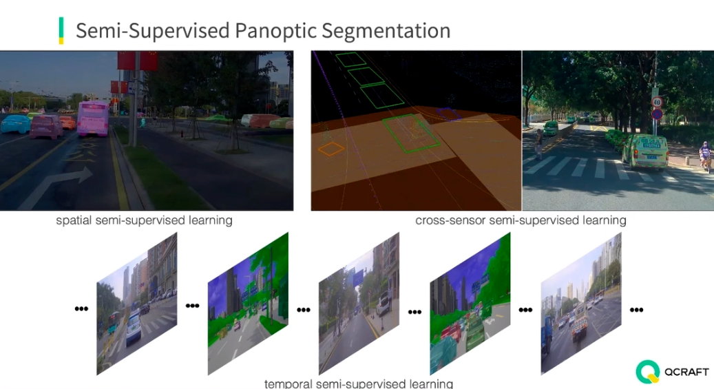 具体来说,可以从三个方面入手解决。第一个方面是空间维度的半监督学习,即在一帧图像中,只标注部分实例,其它的部分通过算法来挖掘。另一个方面是时间维度的半监督学习,利用视频数据的连续性,相邻帧之间变化的区域比较小,只标注关键帧,借助伪标签等半监督学习技术可以节省大量的标注工作量。第三个方面是从多传感器融合的角度出发,比如将点云中标注的点投影到图像,可以生成图像中的标注。这三种方式可以结合起来,最终提高全景分割模型的性能。