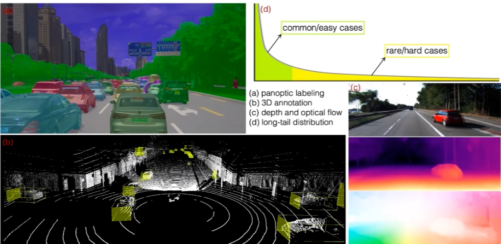 上图所示的是几种典型的感知任务的标注数据。(a)展示的是图像的全景分割,需要进行逐像素的标注,标注非常耗时;(b)是 3D 点云的目标检测框标注,标注难度大且容易出错;(c)所示的是通过单目相机或者是多帧进行逐像素的深度估计或者光流估计,这种任务几乎无法进行人工标注;(d)展示的是感知任务的数据分布,是一个典型的长尾分布。真正有价值的数据,往往集中在分布的尾部,发现并标注这样的数据非常困难,因此传统的人工标注的效率实际上是比较低的。为了解决数据高效的问题,轻舟智航的研究团队从半监督学习、自监督学习和数据合成等方法出发,针对具体的感知任务提出了一系列解决方案。
