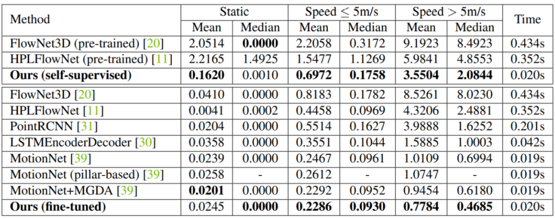 所提出的模型在自动驾驶公开数据集 nuScenes 上进行了评估,下表显示的是和当前先进的算法的比较。可以看到提出的自监督模型取得了比 FlowNet3D 和 HPLFlowNet 更好的性能,而且这两个模型在 FlyingThings3D 和 KITTI SceneFlow 数据集上进行了有监督的预训练。通过在训练集上微调,提出的模型达到了当前最好的性能。