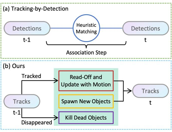 上图(a)所示是一种典型的 tracking-by-detection 框架,检测器在 t-1 和 t 帧分别检测到目标,通过启发式匹配方法进行数据关联,从而完成 t-1 帧到 t 帧的跟踪。图(b)是轻舟智航提出的数据驱动的跟踪方法,绿色框表示的是模型的核心模块。在该模型中,同时处理多目标跟踪中的三个最基本的任务:(1)更新跟踪目标的位置;(2)创建新的轨迹;(3)剔除失效的轨迹。下面,对该模型是如何实现上述三个任务的,进行详细解读。
