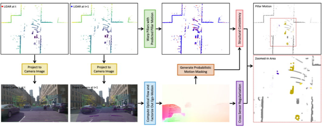 上图所示的是提出的自监督学习的基本框架。在训练阶段,模型的输入是前后两帧点云数据,以及对应的图像数据。该模型的输出是点云中动态目标的运行状态。值得一提的是,图像数据仅仅用于训练阶段提供正则约束,在推理阶段,仅有上图所示上半部分点云相关的分支,因此在推理阶段模型十分高效。