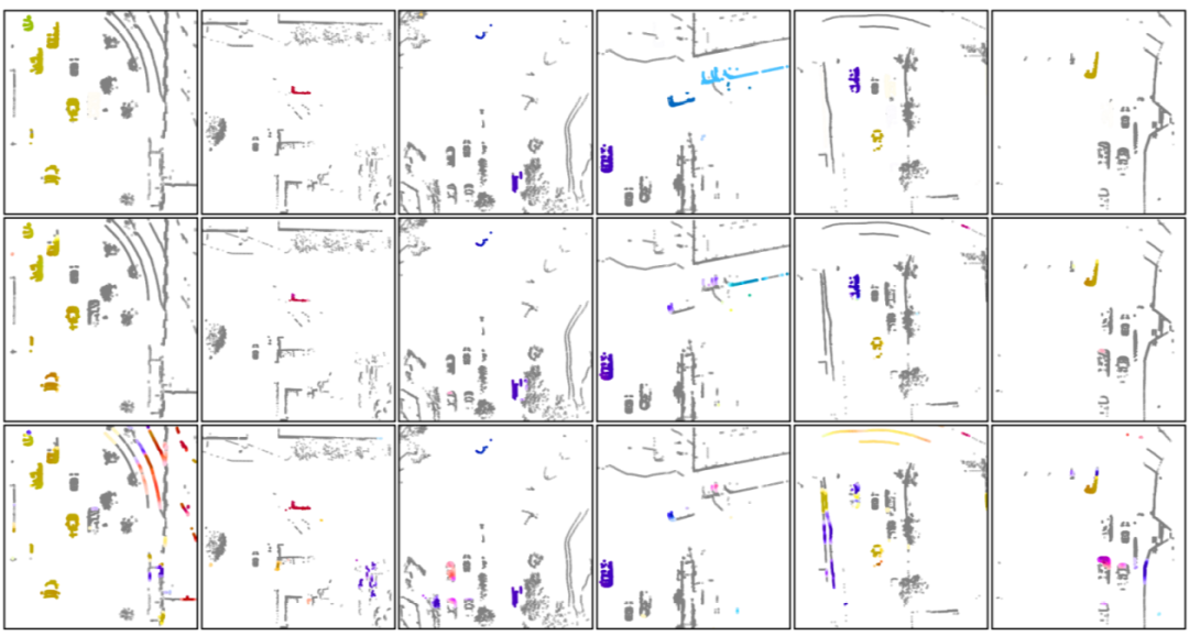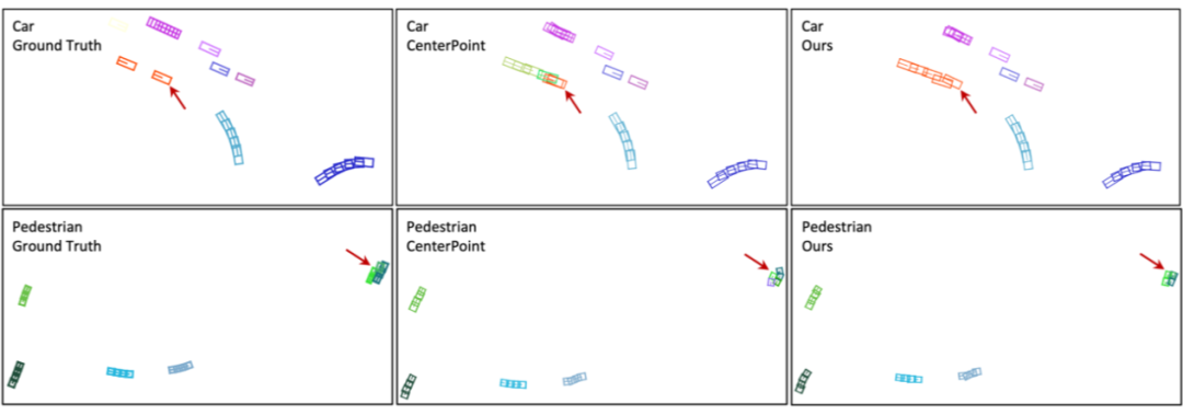 上图为在 nuScenes 数据集上车辆和行人跟踪的可视化结果,左侧第一列为真值,中间列为 CenterPoint 的跟踪结果,右侧是 SimTrack 的结果,不同的颜色代表不同的目标 ID。可以看到 SimTrack 相比 CenterPoint 跟踪效果更加鲁棒。