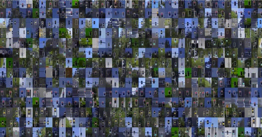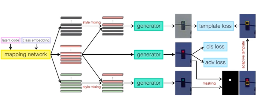 为了生成闪烁的红绿灯图像,除了类别可控的生成,还需要解决状态可控的生成,比如,生成红灯由亮到灭的图像。为了解决这个问题,研究团队提出一种通过样式特征组合和自适应生成模版的方法可以实现这个目的。上图所示红色代表红灯样式特征,灰色代表灯灭特征,绿色代表绿灯特征。虽然通过样式特征组合,红灯和绿灯生成的效果较好,但是灯灭的效果并不理想。研究团队进一步利用出自适应生成模板,根据模板推断灯灭的位置,然后用这个模板去督导灯灭的数据生成,从而可以生成更加逼真的灯灭的数据。最终的闪烁红绿的的生成效果如下图所示。