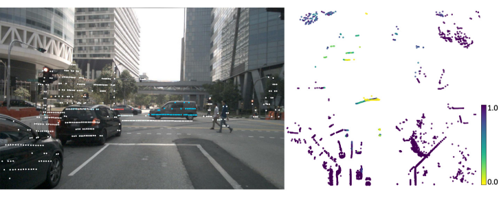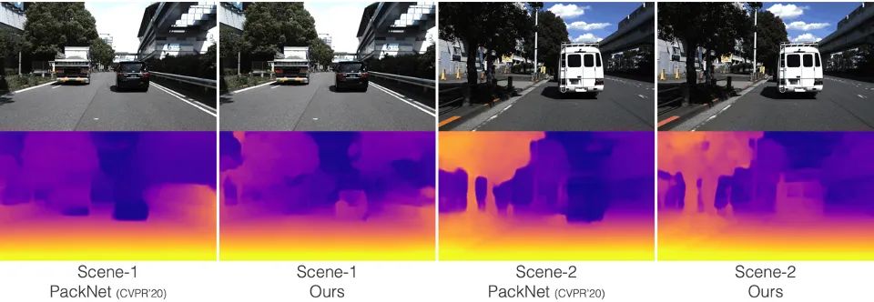 上图所示为单目深度估计的实验对比,其中 PackNet 是 CVPR'20 提出的深度估计模型,可以看到研究团队设计的模型相比该模型有明显性能提高,尤其是对运动目标的深度估计。PackNet 对上图中运动的黑车和白车深度估计不准确,将其估计为无穷远点,而轻舟智航研究团队提出的方法很好地克服了这一问题。