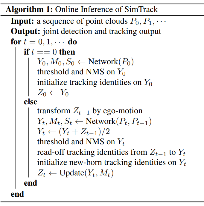 上述模型结构用于训练阶段,在推理和测试阶段,还将结合上一时刻的 centerness map 进行优化。推理的算法流程如上图所示,对于 t=0 时刻,网络只执行检测任务,用于初始化跟踪轨迹。对于 t>0 时刻,先将上一时刻的 centerness map 通过自车位姿估计转换到当前时刻,转换后的 centerness map 和当前时刻的 centerness map 相加求平均,得到当前时刻的检测结果,该检测结果通过上一时刻对应的格网位置直接得到目标的跟踪索引,同时通过阈值判断剔除失效的跟踪目标,对新的检测目标,初始化新的跟踪轨迹。最后,使用运动估计分支预测的目标偏移,更新当前帧目标的位置。