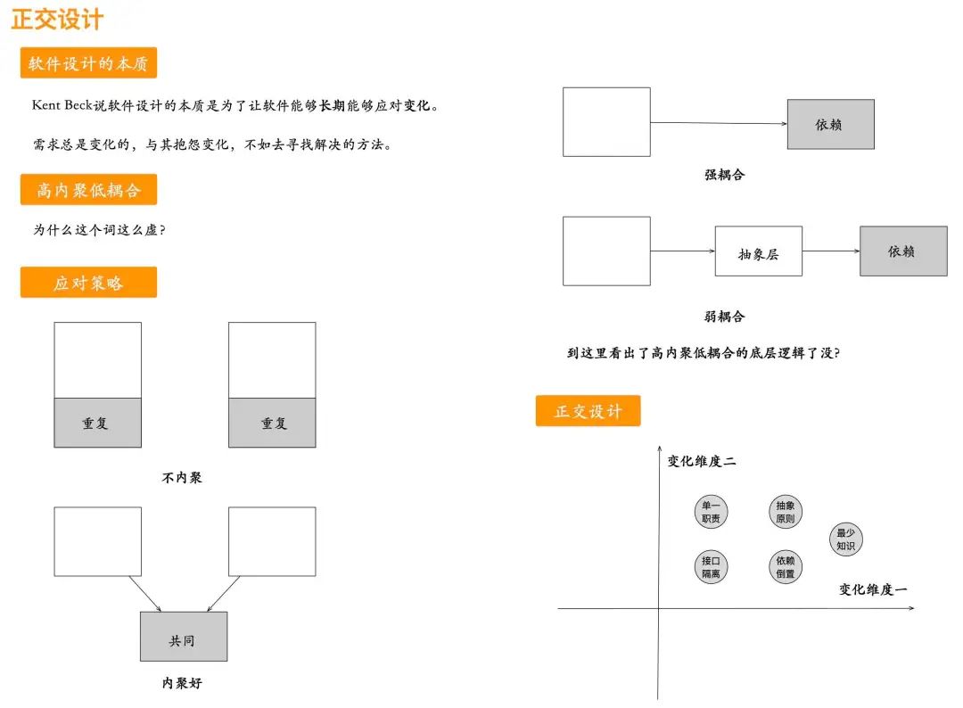 我们在数学中学习过正交,最简单的理解是两条线是垂直的,在软件中我们看到一些逻辑中包含了很多的逻辑,每次修改的时候,改了这个逻辑结果影响了另外一个逻辑,说明我们的逻辑耦合度比较高。正交原则即是分离出不同的变化点,让变化自治,即每个变化只影响自身,不会影响到其它的变化点。平时我们写代码中有两种场景影响正交:代码重复和关系依赖,对于重复的代码可以抽取出来,对于依赖的部分,可以抽象一层防腐层出来。