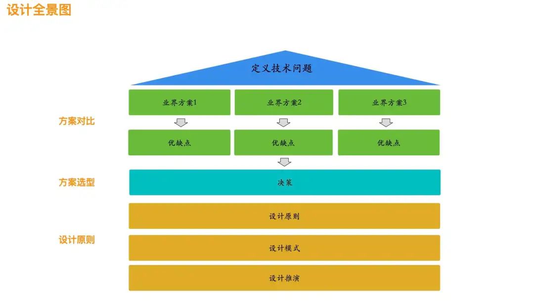 当定义好了技术问题,接下来就要调研业界对这个问题有哪些方案,每个方案的优缺点是什么,比如数据一致性,有事务型解决方案,也有补偿型解决方案,结合业务本身去做选择,这个选择就包含了决策,决策就意味着取舍和平衡,并不是随意的决策,而是有决策的依据来支撑,比如经验、原则、数据等。
