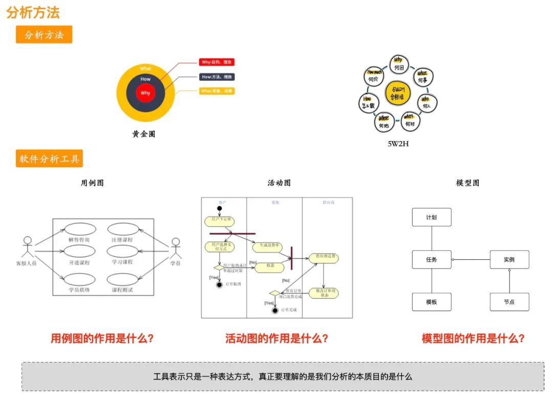 在实际中,我们会看到各种各样的分析方法,这些方法本身并不重要,重要的是它能给我们带来什么的帮助,为什么需要它,个人的观点是分析方法不要贪多,真正融汇到实际中,有那么1、2个方法就足已,不要迷失在各种各样的分析方法中,真正还是要了解分析的本质是什么,在第一部分中,已经提到分析的本质是要洞察出事物的组成,包含组成结构和运行机制,你再去看各种各样的分析方法,它们都是为了找出事物的组成结构和运行机制。如黄金圈分析方法,它就包含了三层(Why、What、How),分析事物不断从宏观到微观、从目的到实现;再比如5W2H,真正的把一件事分析得非常仔细,什么人在什么时间什么地点因为什么做了什么事。
