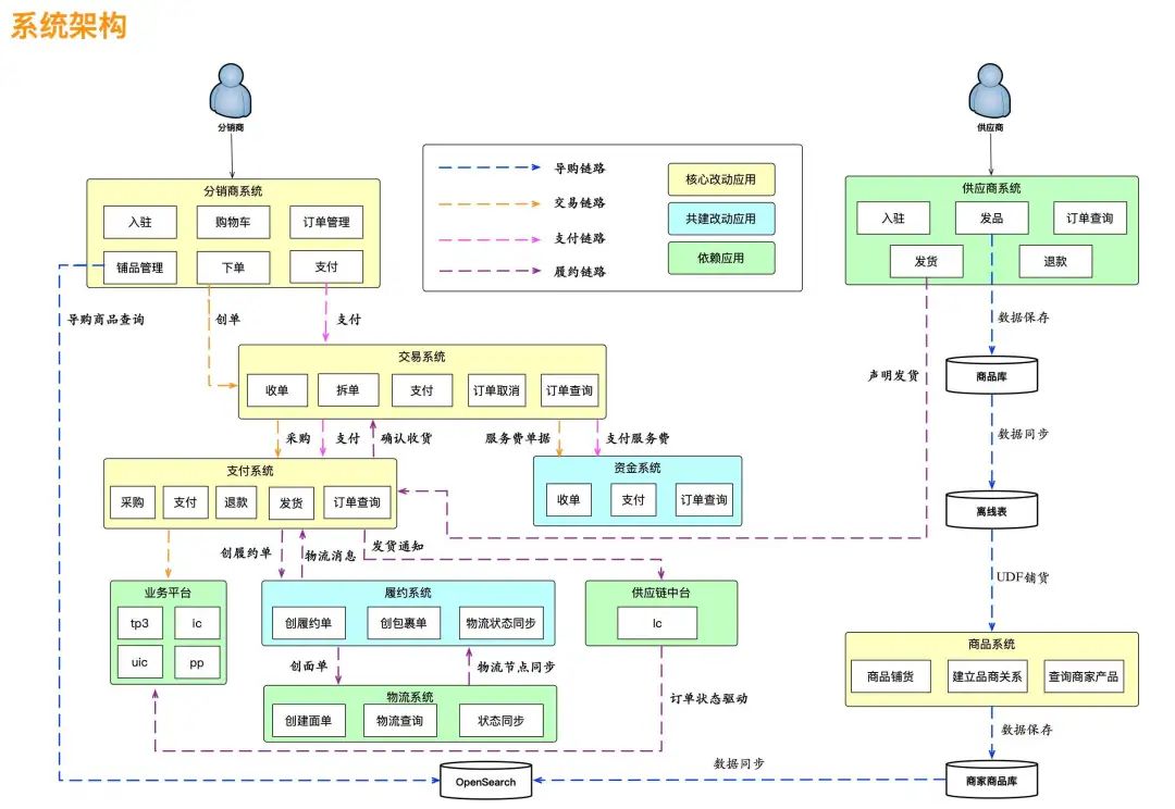 对于上面提到的9个设计原则,这里主要聊的是系统性原则和正交原则,系统性原则是站在全局上思考系统之间的交互,这个是非常重要的,相当于是指明灯,当看懂了整个系统未来的样子,在当下每一步的执行都清楚知道是为了什么。反之没有这个系统性原则,所做的事都只是关注点状事情,不成体系。以2.3节中的例子来讲,当分析出来要做的事情后,如下图画出系统架构图。从系统架构图中可以看出系统之间的交互是怎样的、链路逻辑是怎样的(注:逆向链路没有表达出来)。