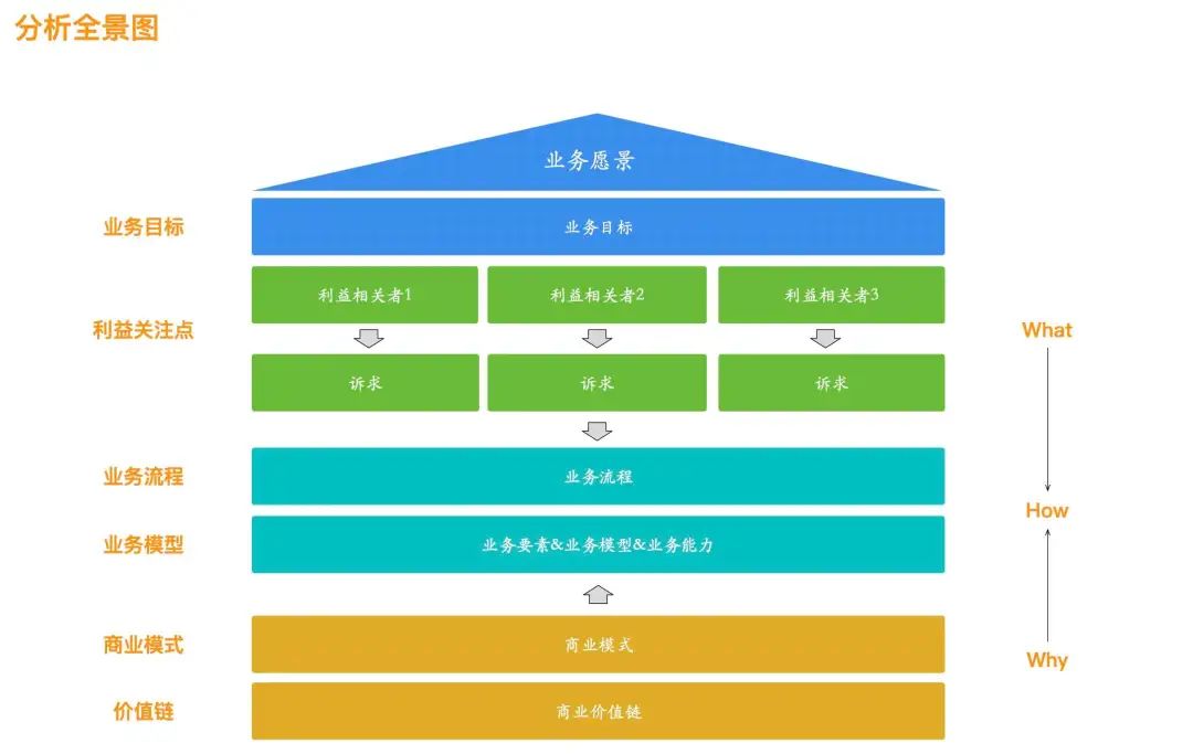 分析往上看一层,就是要分析商业价值链和商业模式,虽然这一块并不是开发同学负责的范畴,了解一些还比较好,能让我们对业务有更深刻的认识,商业模式决定商业结构,商业结构决定交易结构,交易结构决定业务组成结构。利益相关者也是从业务组成结构中推导出来的,这一部分是最顶层的分析,分析业务的可行性,也即我们常说的Why。