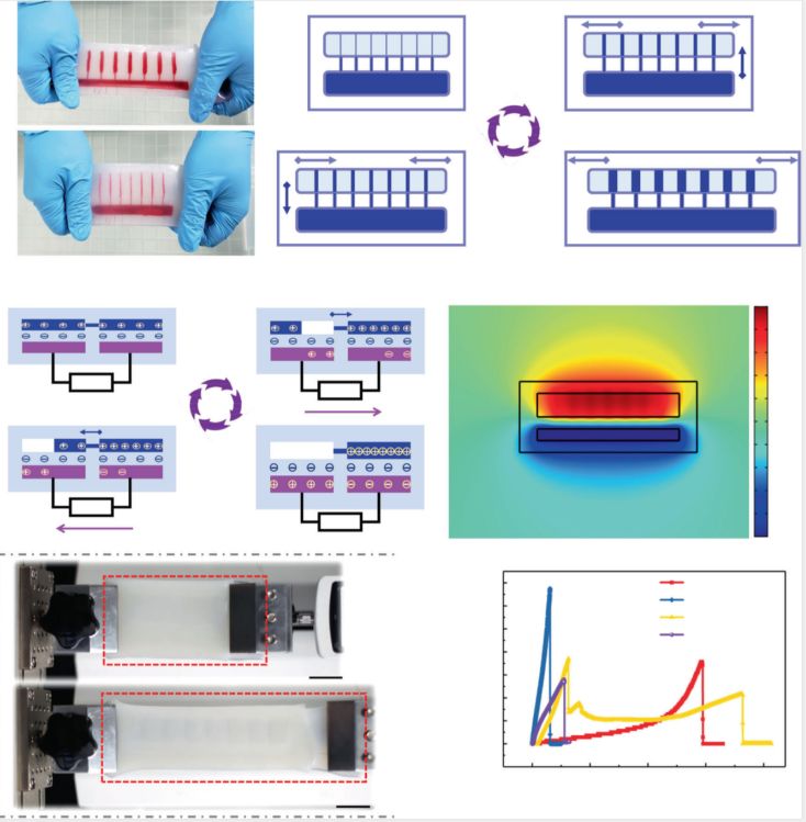 2014年在Advanced Materials期刊上研究人员利用仿真论证了摩擦电纳米发电机理论模型。摩擦电纳米发电机的发电原理是在其内部电路中,由于摩擦起电效应,两个摩擦电极性不同的材料薄层之间会发生电荷转移,从而在二者之间形成电势差。在其外部电路中,电子在电势差驱动下,在分别粘贴在摩擦电材料层背面的两个电极之间或者电极与地之间流动,从而来平衡这个电势差。摩擦电纳米发电机的需求非常广泛,例如给主动感知的机器人供电。各种主动感知和响应的软机器人都是通过自供电的主动摩擦电动机器人皮肤来实现的,这种皮肤在低压环境下具有良好的拉伸性和灵敏度(如上面第二幅图所示)。类似于以上两篇文章中对于摩擦发电的仿真研究,可以利用COMSOL Multiphysics来实现。