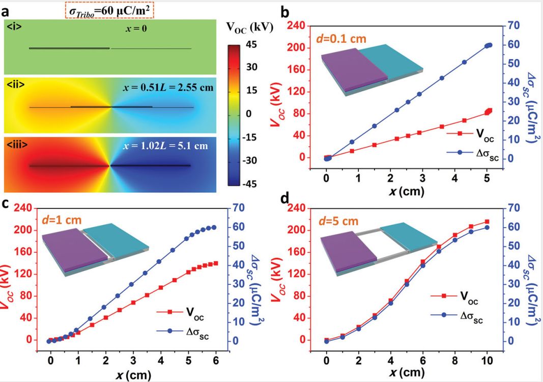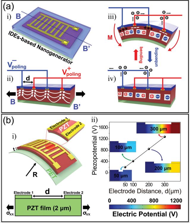 使用有限元数值计算方法研究压电传感器的文章也有很多,例如上面这篇发表在Advanced Materials上的工作通过激光发射工艺在柔性基板上基于有限元数值模拟演示了大面积PZT薄膜,实现了高效、轻便、灵活的压电能量采集装置。文章中还利用仿真模拟计算了输出电压与电极距离的关系。