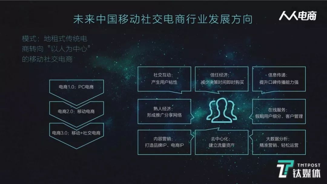 上述人士认为,社交电商应该定义为人与人之间利用某种机制产生交易的方式,核心是围绕着人和货做更高效的连接。在这种设定下,未来,中心化的流量组织形式将不复存在。
