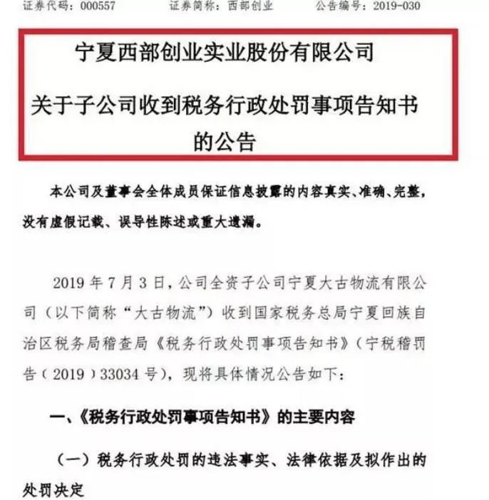去年年中,上市公司西部创业发布公告,其子公司大古物流,因涉嫌虚开增值税发票,逃税6000余万,需要支付各种罚款达1.03亿(不含滞纳金)。