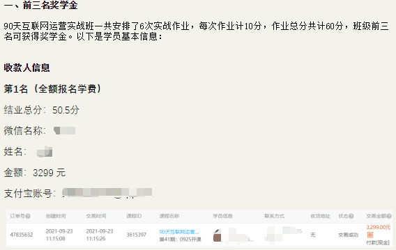 后来,一次偶然,同事在群里发了刚结课的奖学金名单。名单里我一眼就看到了她的名字,她拿到了我们的奖学金!而且是第一名的全额返现!要知道,全额奖学金一个班就只有一个名额。