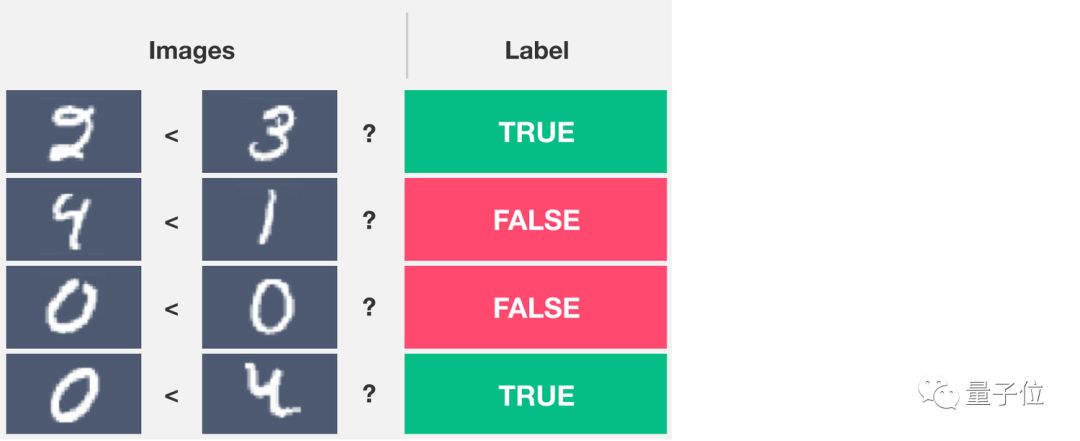 已知一对表示数字的图片,系统需要根据左侧图像数字是否小于右侧图像的数字,输出0或1的标签,如下图所示: