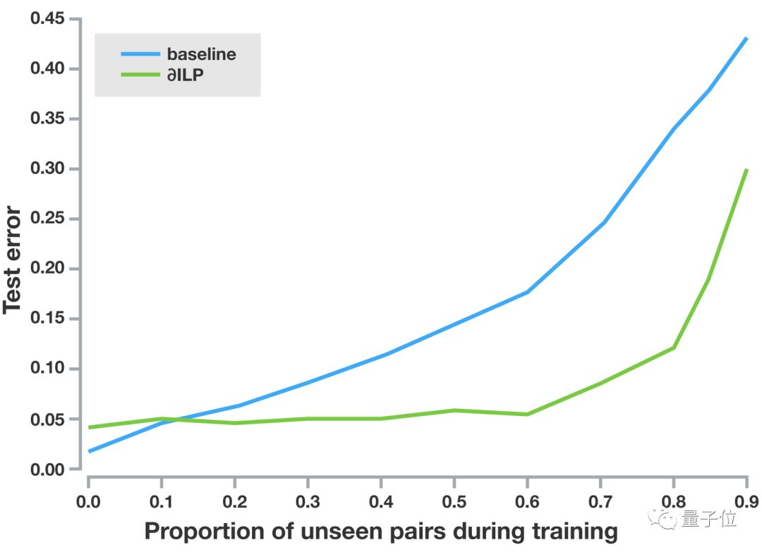 上图总结了我们的“小于”实验:蓝色曲线表示标准的深度神经网络,无法正确泛化到从未见过的数字对,相比之下,在只用40%数字对训练过的情况下,绿色曲线表示的∂ILP依然能保持较低的测试误差。这表明,∂ILP能够进行符号性的泛化。