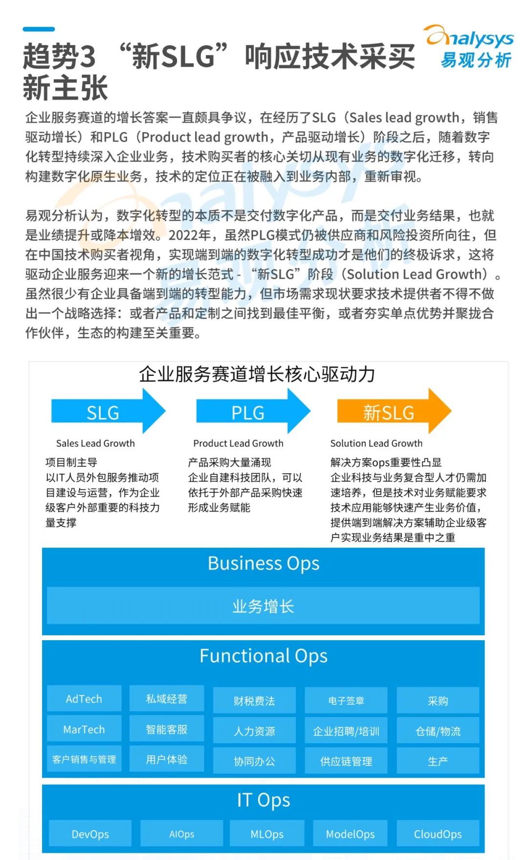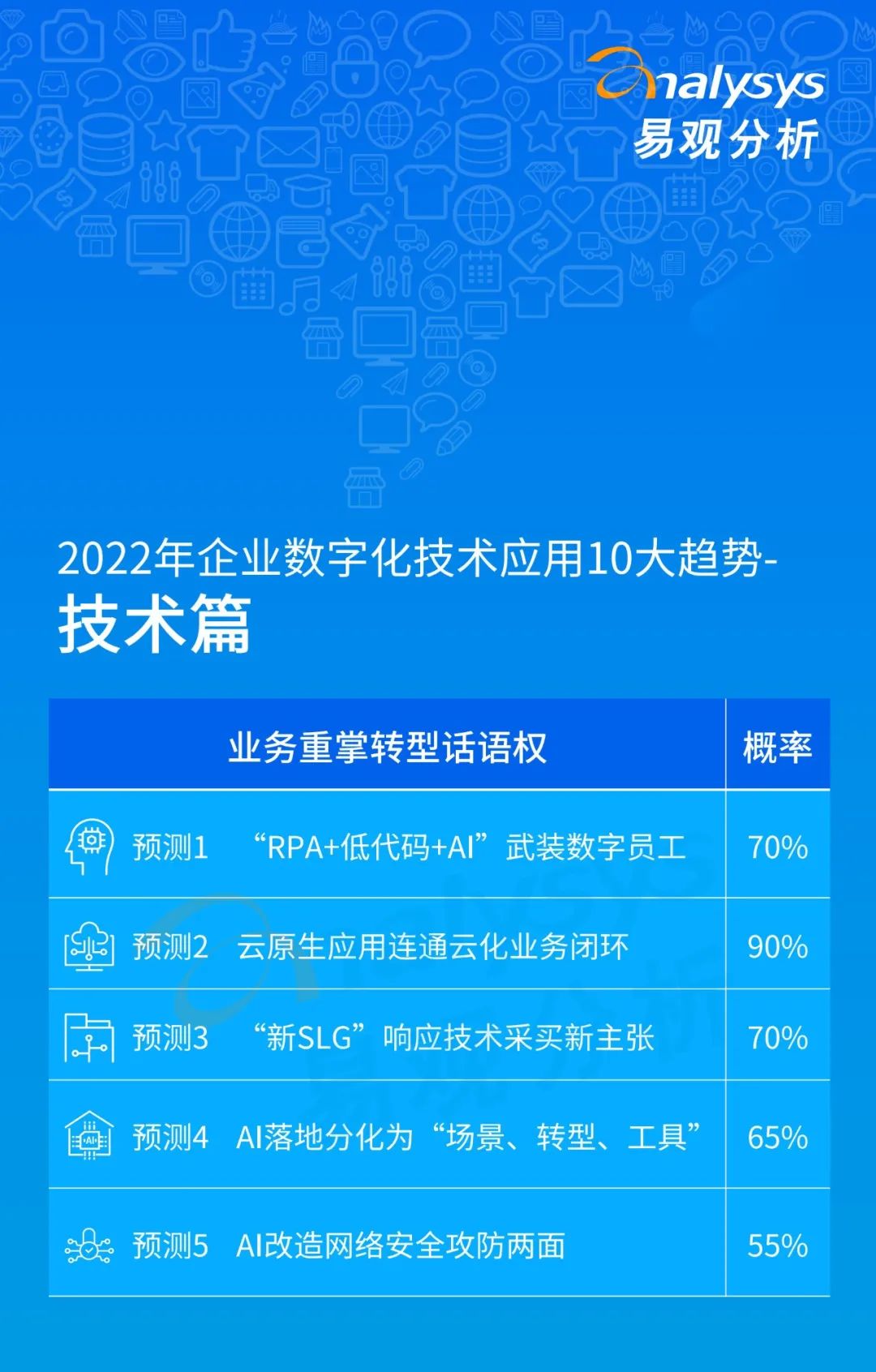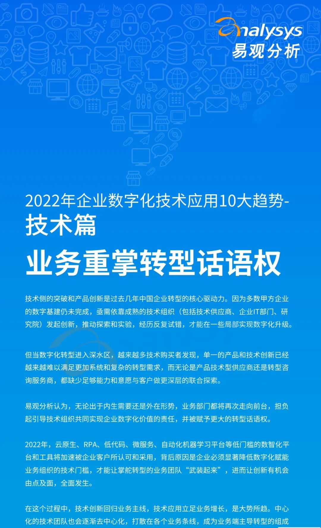 2022年,云原生、RPA、 低代码、微服务、自动化机器学习平台等低门门槛的数智化平台和工具将加速被企业客户所认可和采用,背后原因是企业必须显著降低数字化赋能业务组织的技术门槛,才能让掌舵转型的业务团队“武装起来”,进而让创新有机会由点及面,全面发生。