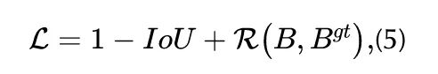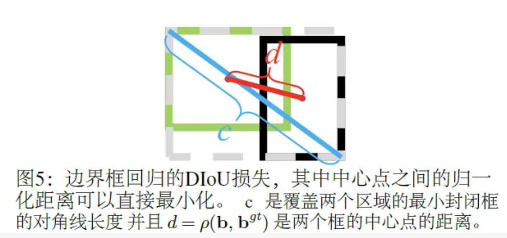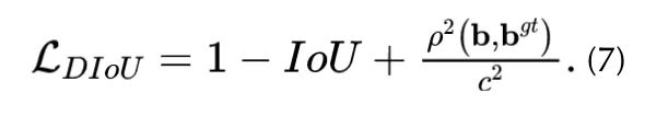 其中 和 分别代表 和 的中心点。 为欧氏距离, 是覆盖两个盒框的最小封闭框的对角线长度。DIoU损失函数可以定义为: