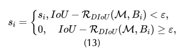 在原始的NMS中, loU指标用于抑制吕余的检测框, 其 中重叠区域是唯一的因素, 对于有遮挡的 情况, 往往会产生错误的抑制。我们在这项工作中建议 是 的更好标准, 因为在 抑制标准中不仅应考虑重叠 被正式定义为: