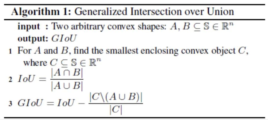 GIoU的设计初衷就是想解决IoU Loss存在的问题(预测框与真实框不相交时iou恒定为0),设计了一套Generalized Intersection over Union Loss。在IoU的基础上,GIoU还需要找到预测框和真实框的最小外接矩形,然后求出最小外接矩形减去两个预测框union的面积,具体算法流程如下: