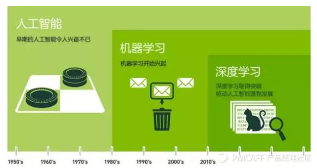 这三个概念是包含关系,人工智能包含机器学习,机器学习包含深度学习,从20世纪50年代开始,随着算法的演化,数据的完善,算力的提升,逐步演化出来,如下图所示: