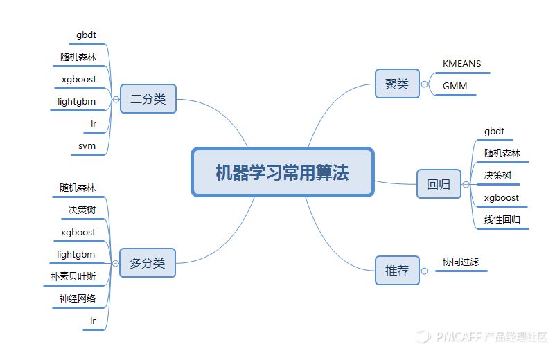 如果只是上文中所说,我们要了解一些常用的算法,机器学习中的算法可以分为几大类,分类算法(二分类和多分类),回归算法,聚类算法,时间序列算法,推荐算法,具体常用算法如下图所示,至于算法的概念大家可以google查询算法详情,这里不再赘述。
