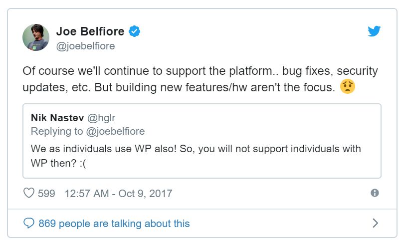 早在 2017 年 10 月,Windows 10 Mobile 官方发言人 Joe Belfiore 在 Twitter 宣布 Windows 10 Mobile 移动操作系统的未来动态,新功能和新硬件不是微软重点,但仍会有修复和安全补丁(即进入维护状态),继续支持企业用户。