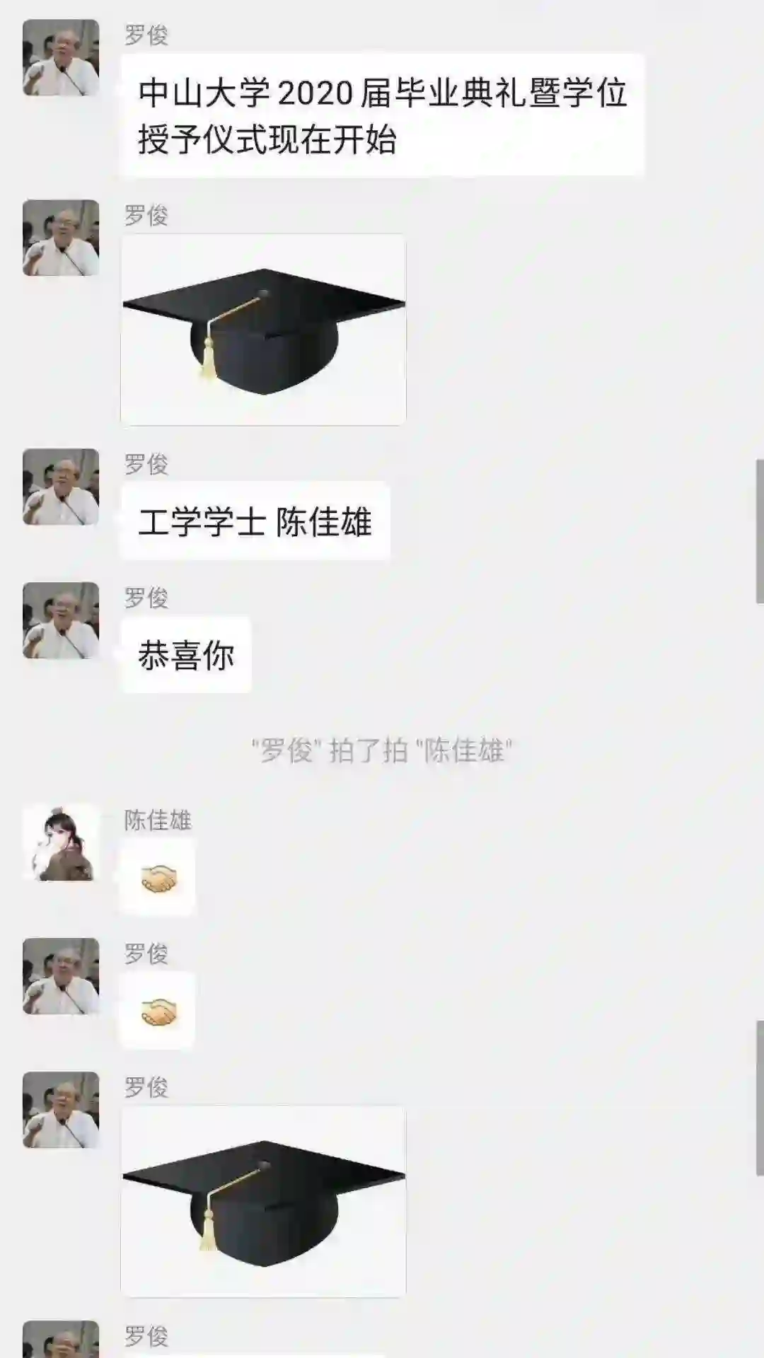 在学校庄严肃穆的远程毕业典礼群里,只有校长可以“碰一碰”毕业生,而不能反过来。
