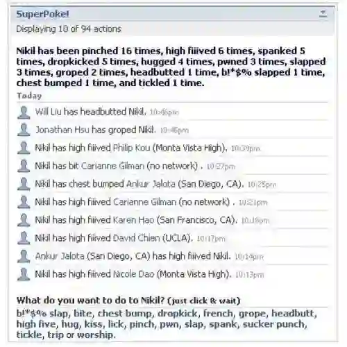 有趣的是,在早期 Facebook 应用商店中可以安装一款名为“SuperPoke!”(超级戳戳!)的应用,除了可以“眨眼”和“拍掌”之外,甚至可以向你的好友“扔一只羊”。该应用最终被谷歌收购,然后被谷歌关闭了。