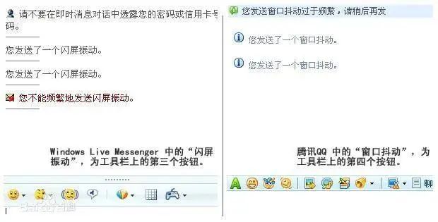 QQ 的窗口抖动则演化出明显的中国特色。起初“窗口抖动”的意义如同“戳”一样不知所云,含蓄的国人为抖动开发了各种用法,比如用作接头暗号。