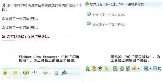 Nudge 中文译作“闪屏振动”,跟“传情动漫”似的有一股水果风。两年后,QQ2007II Beta1(2007.10.18 发布)加入一模一样的功能,你叫“闪屏振动”,我就叫“窗口抖动”。