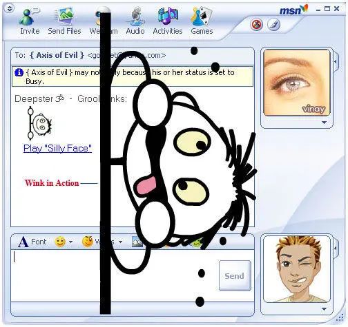 Winks 是一段透明背景的 Flash 动画,选中的时候,会在对话双方的聊天窗口上叠加播放这段动画。有人曾从客户端提取出所有的 Winks 播放效果。