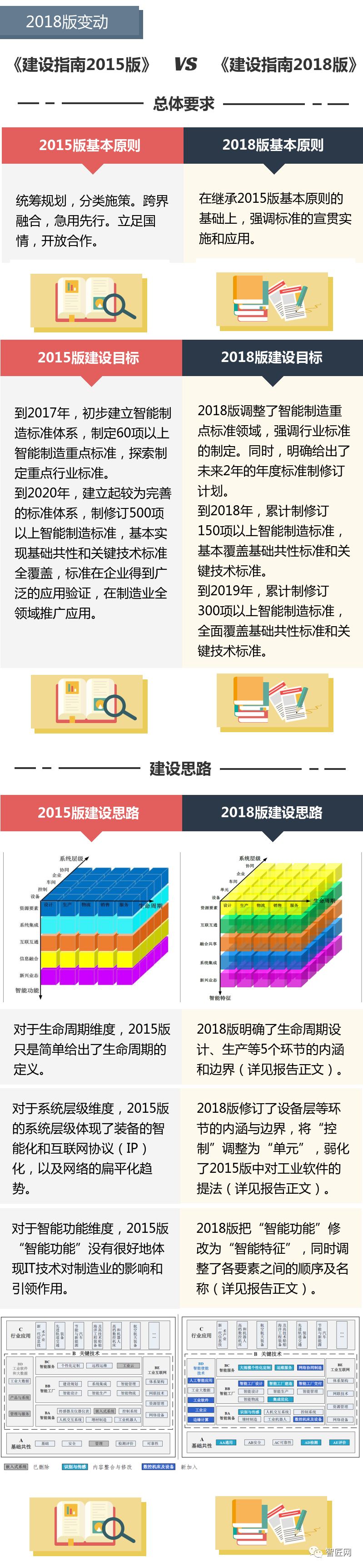 工信部、国标委近日联合发布《国家智能制造标准体系建设指南(2018年版)》(征求意见稿),这是在《国家智能制造标准体系建设指南(2015年)》版本基础上的迭代,从智匠的梳理看来,标准体系结构基本维持原有框架,但在具体建设内容方面增进不少内容,值得业界人士关注。