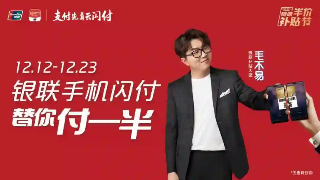 想出这个点子的是中国银联。在以双十二为契机推出的为期12天的银联半价补贴节中,银联喊出了一句霸气十足的广告语——银联替你付一半。虽说活动有封顶金额,但是真金白银的补贴还是吸引了很多消费者。活动期间,在优衣库一件原价120块衬衣, 70元便可拿到手,这直接导致了许多活动店铺门庭若市,现场热闹程度堪比当年苹果新机发布。使用云闪付APP、银联手机闪付、银联二维码支付可享受来自银联的半价补贴。奉上这么大力度的优惠,其目的在于拉新促活,提升消费者对于银联移动支付产品的认知,毛不易因为“名字取得好”,成为这次活动的“补贴大使”。