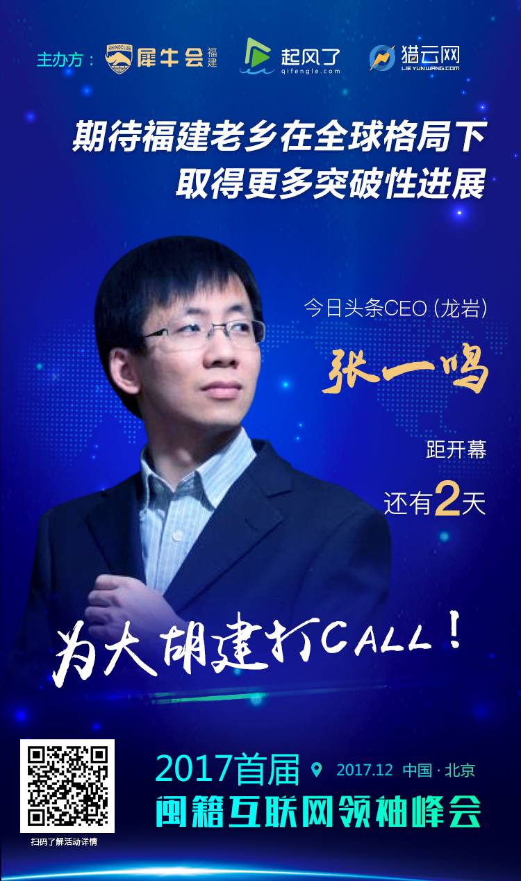 12月23日,闽籍创业群英将齐聚“为大胡建打CALL”首届互联网领袖峰会。此次峰会即将在京召开,千人规模,由犀牛会、起风了、猎云网共同主办。10+顶级闽籍行业大咖分享创投经验,30+闽籍创投机构鼎力支持,50+闽籍优秀创业者分享行业干货,20+闽籍主流媒体助阵,1000+闽籍互联网从业者聚力京城。本次峰会将会评选出“2017年度闽籍创业领军人物”、“2017年度闽籍新锐创业者”及“2017年度闽籍杰出投资人”奖项。