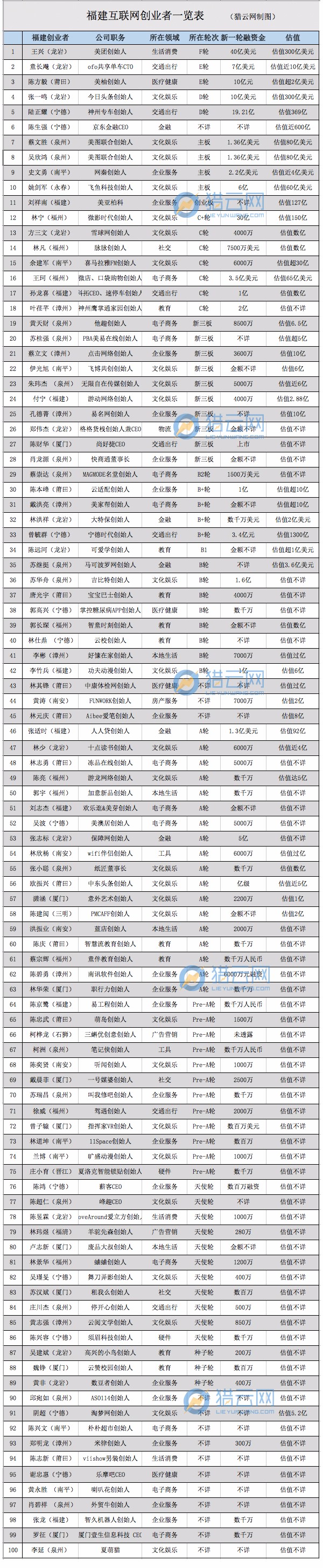 经过梳理,猎云网(微信号:ilieyun)挖掘了福建创业者新100人,数据仅供参考。