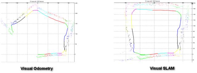勇气号和机遇号火星车所用的VO的优点是自主性强、精度较高,能改正航迹推算方法在车轮打滑和IMU漂移时的定位误差;其缺点是计算速度慢、只能应用于局部定位,性能依赖于地形特征。VO速度慢是由于火星车计算机的计算能力限制,现在计算机软硬件技术都有了飞速的发展,计算能力已经可以克服。