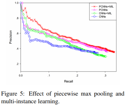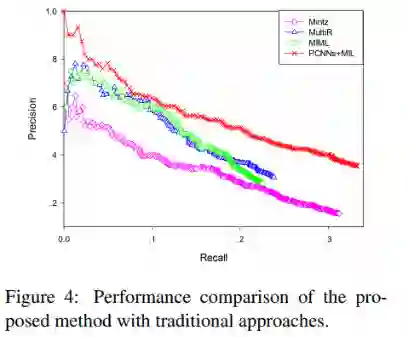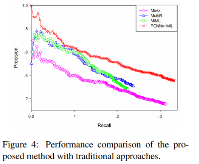 从下面的实验结果中可以看到,无论是查准率还是查全率,PCNNs+MIL模型都显著优于其他模型,这说明用卷积神经网络作为自动特征抽取器,可以有效降低人工构造特征和NLP工具提取特征带来的误差。