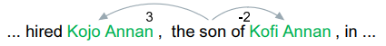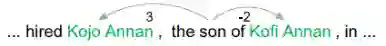 比如下面这个句子中,单词son和实体Kojo Annan的相对距离为3,和实体Kofi Annan的相对距离为-2。