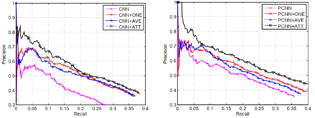 句子编码器分别采用CNN和PCNN的网络结构,PCNN+ONE表示PCNN结合多实例学习的模型,PCNN+ATT表示论文中的选择性注意力模型,PCNN+AVE表示对各句子求算术平均的模型(每个句子的注意力得分相同)。