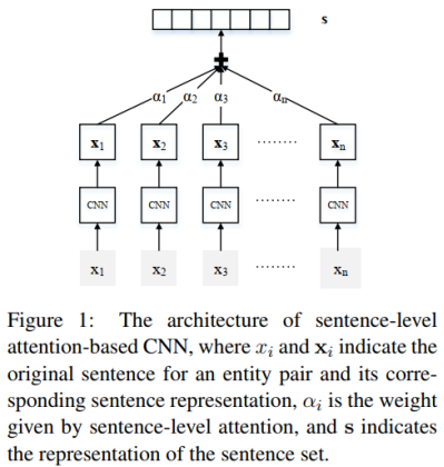 所以这篇论文用句子级别的注意力机制代替多实例学习,对于包含某实体对的所有句子,