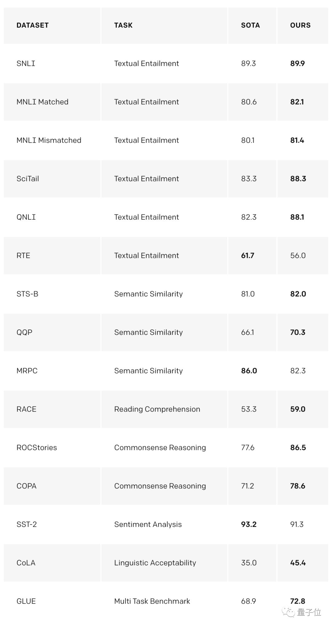 让我们感到尤其兴奋的结果,是这种方法在COPA, RACE和ROCStories三种数据集上的表现。这三种数据集为测试常识推理和阅读理解的表现而设计。
