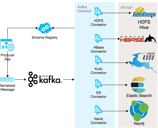 对 Kafka 的集群进行拆分之后,服务的稳定性得到了保障。我们团队的主要工作方向慢慢向帮助技术人员提效和降低大数据技术使用门槛发展。一方面,跨业务消息传递无强制格式要求,业务方通常使用 Json 类型字符串,虽然 Json 使用灵活,但是如果业务产生变更,业务上下游的通知不及时,很容易解析异常;偶尔也会有一些误发送其他 topic 的数据或不完整格式的脏数据被发到集群中,也会导致消息解析失败。另一方面,我们也开始规划以 Kafka 为核心链路,向其他存储如:ES / Hadoop ( Hive,HBase ) / KUDU / ClickHouse / NEO4J 等组件同步数据的方案。业务上只需要一次把数据写入 Kafka 中,即可在各个其他需要的组件中使用该数据,降低了其他组件的接入门槛,从传统的安装大数据环境 → 数据导入→ 清洗为列式存储再进行查询,到在业务代码发送数据到 Kafka 后直接通过查询引擎 ( 如 Presto ) 查询,便利地享受大数据带来的红利。结合了跨业务方对数据格式的需求和下游系统大部分需要依赖数据的结构同步,我们引入了 AVRO 的序列化方式。