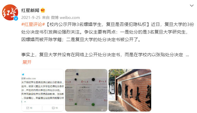 2021年9月,网传复旦大学处分决定引发网络热议。处罚决定显示,三名复旦大学的硕博生,因校外嫖娼被开除学籍!其中两人分别为2019级和2020级硕士研究生,一人为2019级博士研究生。