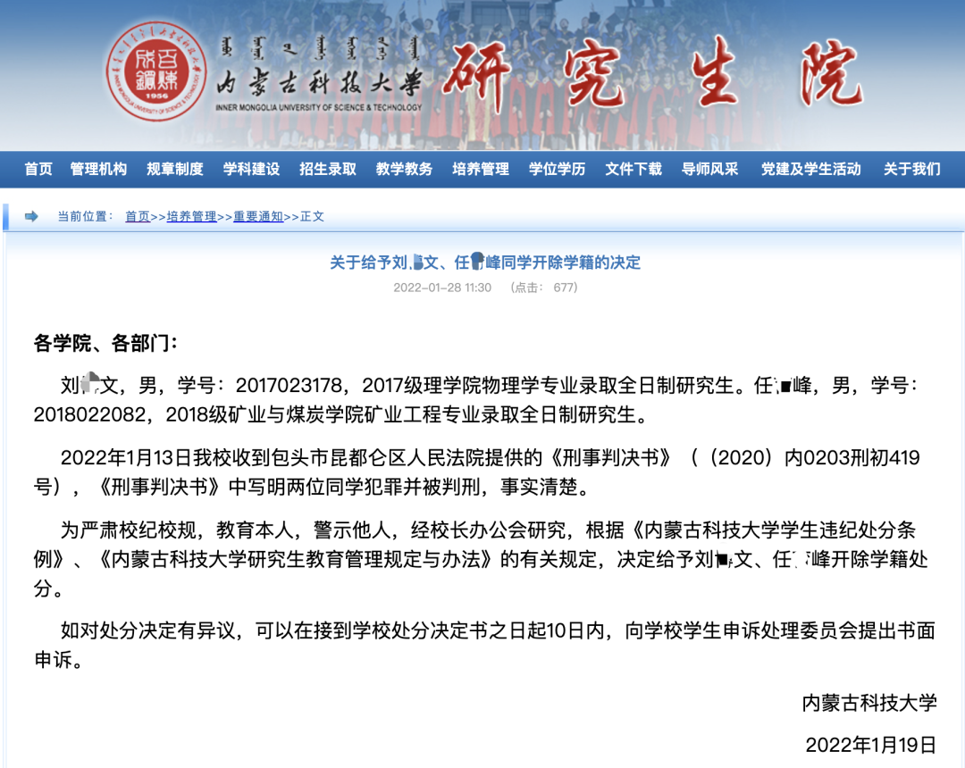 近日,内蒙古科技大学官网发布关于给予刘某文、任某峰同学开除学籍的决定。