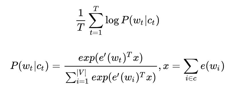 对于 CBOW 而言,我们可以从它的名字上一窥究竟,它的全称是 Continuous Bag-of-Words,也就是连续的词袋模型,为什么取这个名字,先来看看它的目标函数。